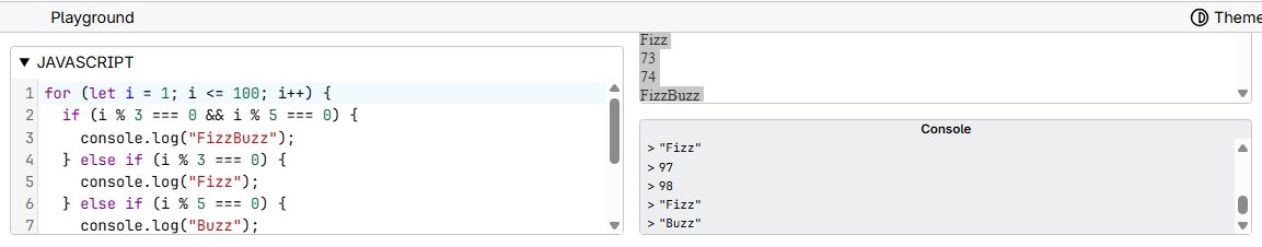 - JavaScript FizzBuzz program that prints numbers from 1–100 with conditional logic